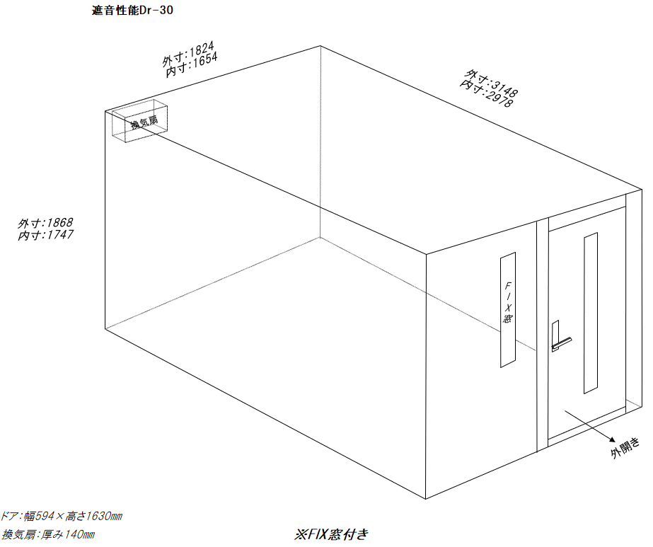 外寸:1824×3148(換気扇+140)×1868㎜ 内寸:1654×2978×1747㎜ |