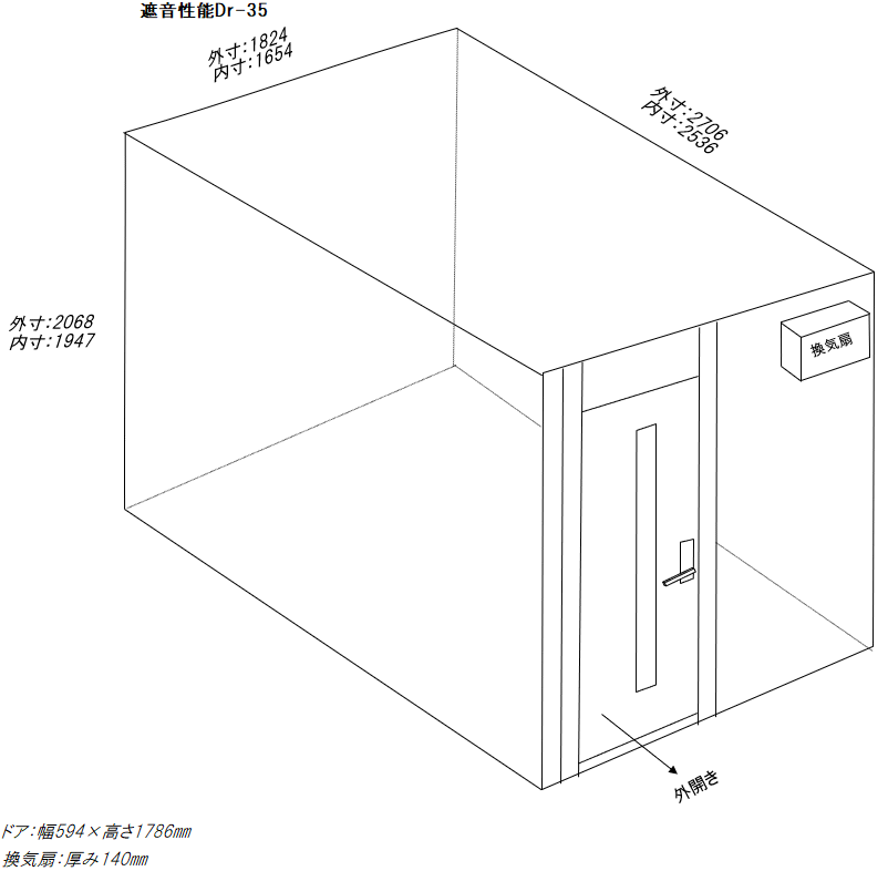 外寸:1824×2706(換気扇+140)×2068㎜ 内寸:1654×2536×1947㎜ |