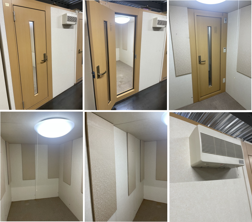仕様 | 床:底床・遮音床パネル・カーペット仕上げ 壁:遮音壁パネル・非塩ビ無機質クロス(ホワイト系) ・壁掛け音場パネル布クロス仕上げ(ピンク系) 天井:遮音天井パネル 非塩ビ無機質クロス(ホワイト系) 非塩ビ木口化粧仕上げ(木目調) ドア:木製防音ドア(透明ガラス窓付き)・非塩ビ木口化粧仕上げ(木目調) 装備:換気扇・2口コンセント・照明・音場パネル |