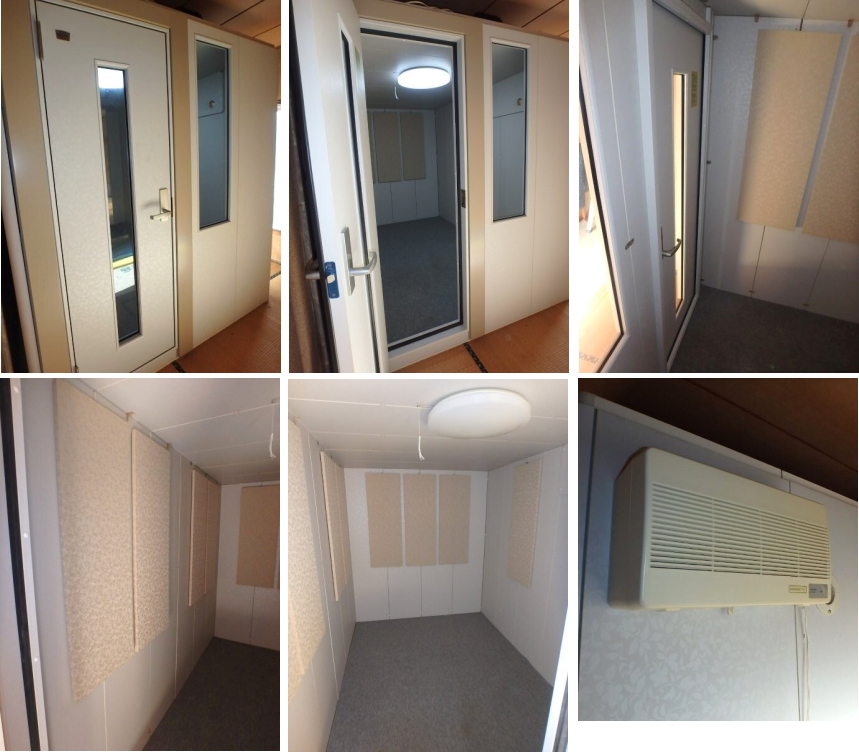 | 仕様 | 床:底床+遮音床パネル・カーペット仕上げ 壁:遮音壁パネル・内外装仕上げ:化粧紙(ホワイト系) 天井:遮音天井パネル・内外装仕上げ:化粧紙(ホワイト系) ドア:木製防音ドア(透明ガラス窓付き)・表面:化粧紙仕上げ・ゲート:ベージュ 装備:換気扇・2口コンセント・照明・FIX窓・音場パネル |