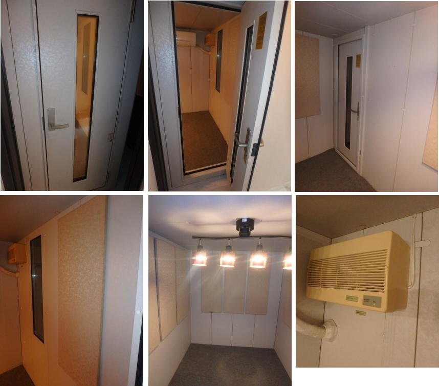 仕様 | 床:底床・遮音床パネル・カーペット仕上げ 壁・天井:遮音壁パネル・内装仕上げ:化粧紙(天井:ホワイト系) 外装仕上げ:化粧紙(ホワイト系) ドア:木製防音ドア(2重透明ガラス窓付)・表面:化粧紙仕上げ 装備:照明・換気扇・2口コンセント・FIX窓・音場パネル |