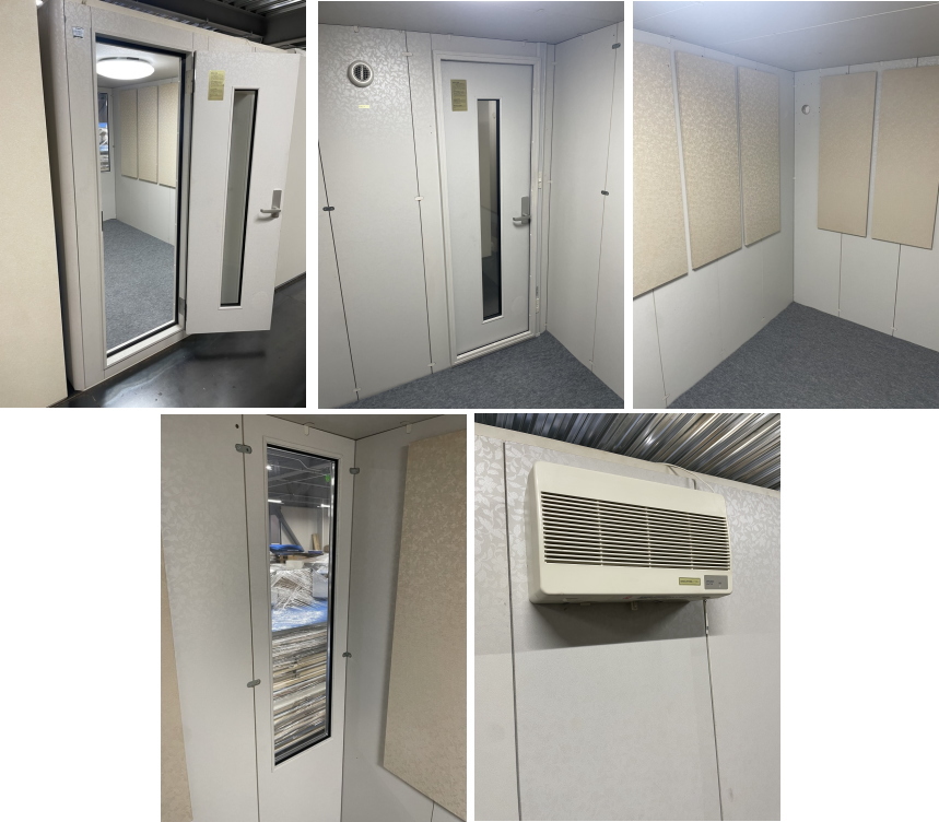 | 仕様 | 床:底床・遮音床パネル・カーペット仕上げ 壁・天井:遮音壁パネル・内装仕上げ:化粧紙(天井:ホワイト系) 外装仕上げ:化粧紙(ホワイト系) ドア:木製防音ドア(2重透明ガラス窓付)・表面:化粧紙仕上げ 装備:照明・換気扇・2口コンセント・FIX窓・音場パネル |