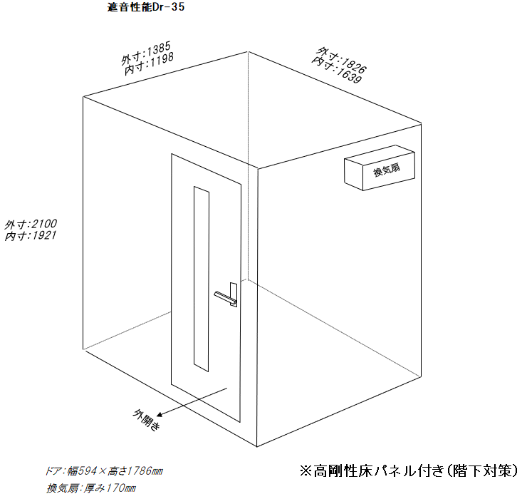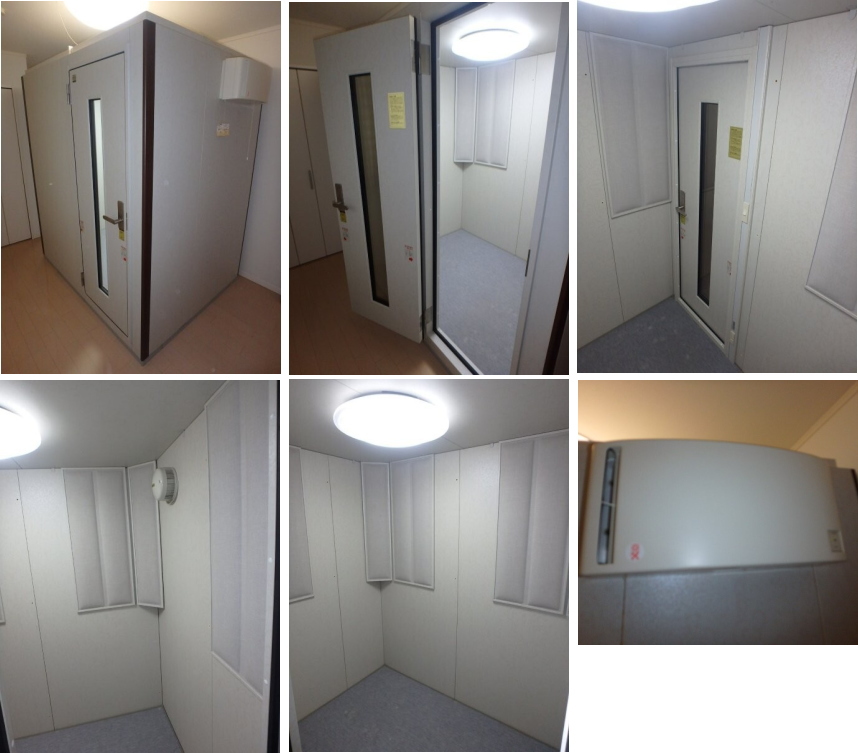 | 仕様 | 床:底床+防振ゴム+床フレーム+遮音床パネル・高剛性床パネル・カーペット仕上げ 壁:遮音壁パネル 内外装仕上げ:強化化粧紙(パールホワイト色) コーナー化粧カバー:ABS樹脂押出材 天井:遮音天井パネル 内外装仕上げ:強化化粧紙(パールホワイト色) ドア:木製防音ドア(2重透明ガラス窓付き)・表面:強化化粧仕上げ(パールホワイト色) 装備:換気扇・2口コンセント・照明・音場パネル・コーナー音場パネル |