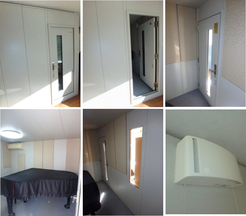 | 仕様 | 床:分割浮床パネルシステム 防振ゴム+床フレーム+遮音床パネル・カーペット仕上げ 壁:遮音壁パネル 内外装仕上げ:強化化粧紙(パールホワイト色) コーナー化粧柱:パールホワイト色 天井:遮音天井パネル 内外装仕上げ:強化化粧紙(パールホワイト色) ドア:木製防音ドア(2重透明ガラス窓付き) 表面:強化化粧仕上げ(パールホワイト色) 装備:換気扇・2口コンセント・照明・FIX窓・音場パネル |