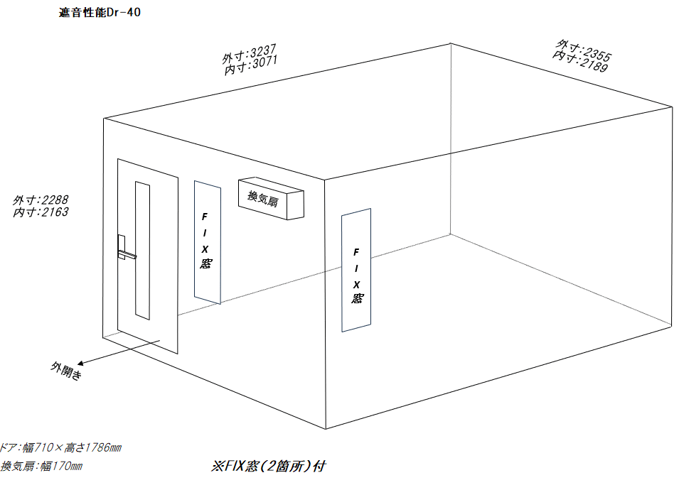 | 仕様 | 床:分割浮床パネルシステム・防振ゴム+床フレーム+遮音床パネル+カーペット仕上げ 壁:遮音壁パネル・内外装仕上げ:化粧紙(パールホワイト色)・コーナー化粧柱:パールホワイト色 天井:遮音天井パネル・内外装仕上げ:化粧紙(パールホワイト色) ドア:木製防音ドア(2重透明ガラス窓付き)・表面:化粧紙仕上げ(パールホワイト色) 装備:照明・換気扇・2口コンセント・音場パネル・FIX窓(2ヶ所) |
