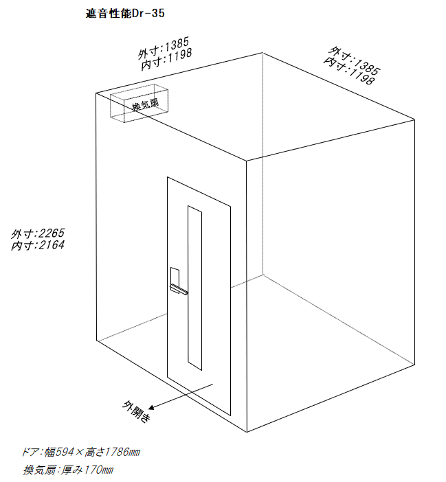 | 仕様 | 床:底床+遮音床パネル・カーペット仕上げ 壁:遮音壁パネル 内外装仕上げ:強化化粧紙 コーナー/化粧柱カバー:ABS樹脂押出材 天井:遮音天井パネル 内外装仕上げ:強化化粧紙 ドア:木製防音ドア(透明ガラス窓付き)・表面:強化化粧仕上げ 装備:換気扇・2口コンセント・照明・音場パネル |