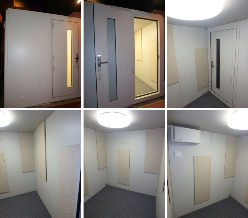 | 仕様 | 床:床フレーム+遮音床パネル カーペット仕上げ 壁:遮音壁パネル 内外装仕上げ:強化化粧紙(パールホワイト色) コーナー/化粧カバー:パールホワイト 天井:遮音天井パネル 内外装仕上げ:強化化粧紙(パールホワイト色) ドア:木製防音ドア(透明ガラス窓付き)・表面:強化化粧紙仕上げ(パールホワイト色) 装備:換気扇・2口コンセント・照明・音場パネル |