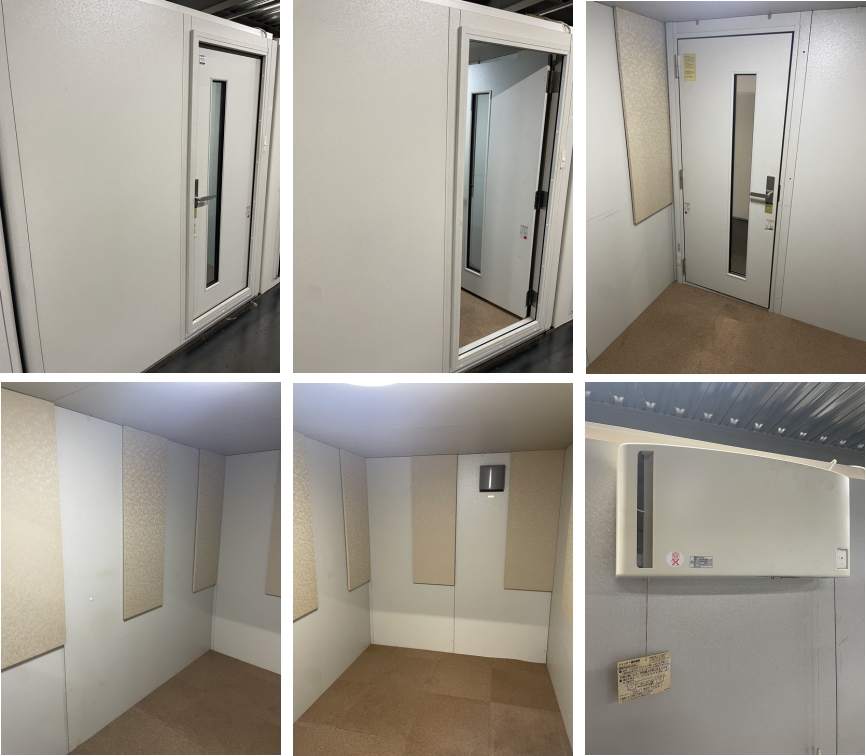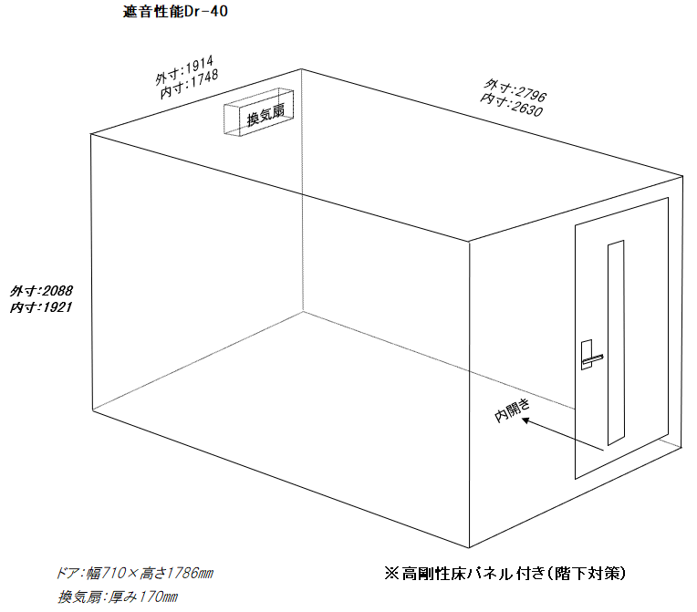 | 仕様 | 床:防振ゴム+床フレーム+高剛性床パネル+遮音床パネル・カーペット仕上げ 壁:遮音壁パネル・外装仕上げ:化粧紙(パールホワイト色) コーナー化粧柱:パールホワイト色 天井:遮音天井パネル・外装仕上げ:化粧紙(パールホワイト色) ドア:木製防音ドア(2重透明ガラス窓付き)・表面:化粧紙仕上げ(パールホワイト色) 装備:換気扇・2口コンセント・照明・音場パネル |