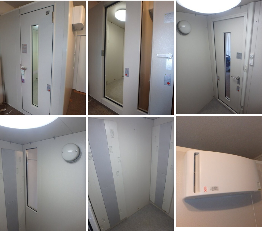 | 仕様 | 床:底床+遮音床パネル・カーペット仕上げ 壁:遮音壁パネル 内外装仕上げ:オレフィンシート(ホワイト系) 天井:遮音天井パネル 内外装仕上げ:オレフィンシート(ホワイト系) ドア:木製防音ドア(透明ガラス窓付き)・内外装仕上げ:オレフィンシート(ホワイト系) 装備:照明・換気扇・2口コンセント・音場パネル・FIX窓 |