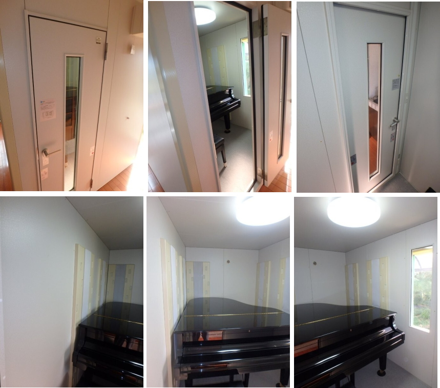 仕様 | 床:床フレーム+遮音床パネル+カーペット仕上げ 壁:遮音壁パネル 内外装仕上げ:オレフィンシート(ホワイト系) コーナー保護カバー:ABS樹脂押出材 天井:遮音天井パネル 内外装仕上げ:オレフィンシート(ホワイト系) ドア:木製防音ドア(2重透明ガラス窓付)・内外装仕上げ:オレフィンシート(ホワイト系) 装備:照明・換気扇・2口コンセント・音場パネル |