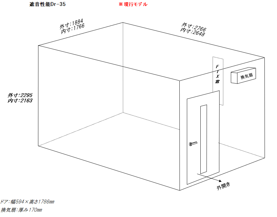 外寸:1884×2766(換気扇+170)×2295㎜ 内寸:1766×2648×2163㎜ |
