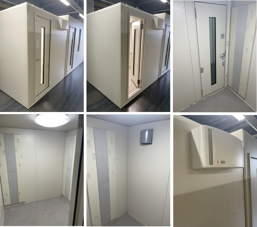 | 仕様 | 床:防振ゴム+高剛性床パネル+遮音床パネル、カーペット仕上げ 壁:遮音壁パネル 内外装仕上げ:オレフィンシート(ホワイト系) コーナー保護カバー:ABS樹脂押出材(ホワイト系) 天井:遮音天井パネル、内外装仕上げ:オレフィンシート(ホワイト系) ドア:木製防音ドア(2重透明ガラス窓付き)・内外装仕上げ:オレフィンシート(ホワイト系) 装備:照明・換気扇・2口コンセント・音場パネル |