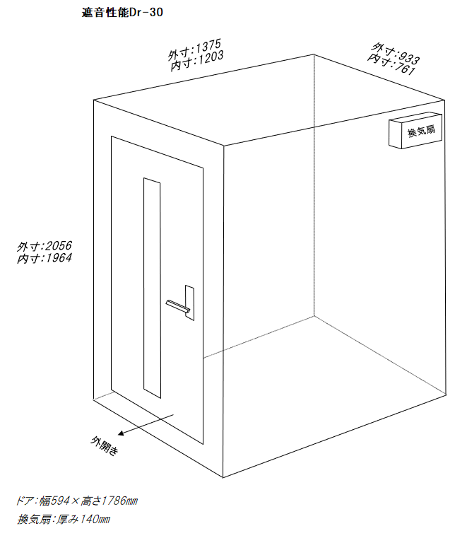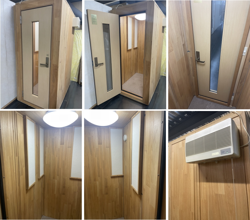 | 仕様 | 床:底床+遮音床パネル・カーペット 壁:遮音壁パネル 桐(天然ポリウレタン塗装仕上げ) 天井:遮音天井パネル 桐(天然ポリウレタン塗装仕上げ) ドア:木製防音ドア(透明ガラス窓付き)・強化化粧紙仕上げ(木目調) 装備:照明・換気扇・2口コンセント・音場パネル |