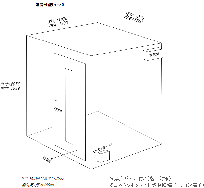 | 仕様 | 床:底床+遮音床パネル・厚床パネル・カーペット仕上げ 壁:遮音壁パネル 桐(天然ポリウレタン塗装仕上げ) 天井:遮音天井パネル 桐(天然ポリウレタン塗装仕上げ) ドア:木製防音ドア(透明ガラス窓付き)・強化化粧紙仕上げ(木目調) 装備:照明・換気扇・2口コンセント・音場パネル・コネクタボックス付き(MIC端子 オス×1/メス×1、フォン端子×1) |