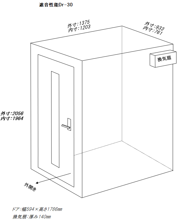 外寸:933(換気扇+140)×1375×2056㎜ 内寸:761×1203×1964㎜ |
