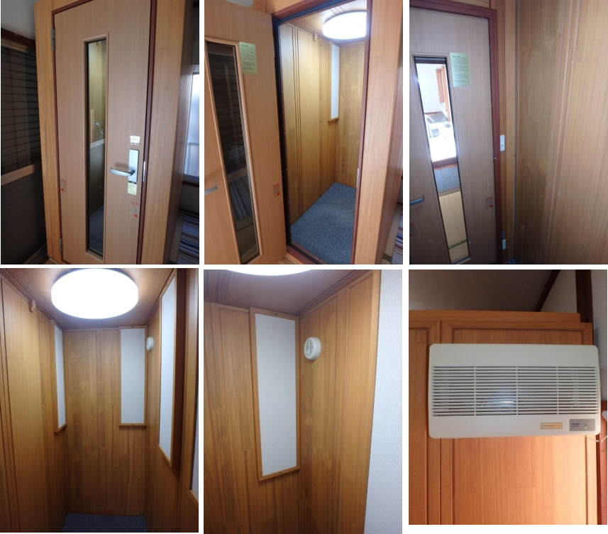 | 仕様 | 床:底床・遮音床パネル・カーペット仕上げ 壁:遮音壁パネル 桐(天然ポリウレタン塗装仕上げ) カラー:ウォームオレンジ 天井:遮音天井パネル 桐(天然ポリウレタン塗装仕上げ) カラー:ウォームオレンジ ドア:木製防音ドア(透明ガラス窓付き)・強化化粧紙仕上げ(木目調) 装備:換気扇・2口コンセント・照明・音場パネル |