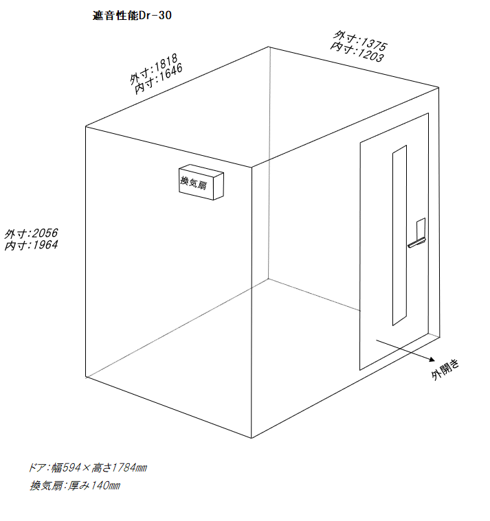 外寸:1375×1818(換気扇+140)×2056㎜ 内寸:1203×1646×1964㎜ |