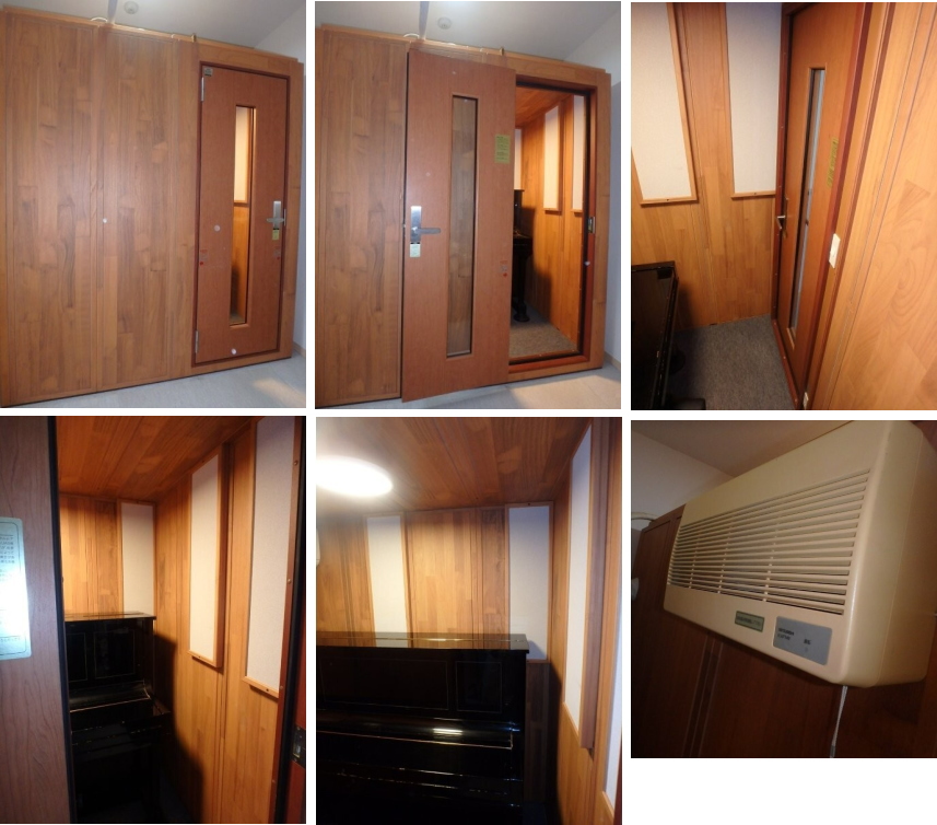 | 仕様 | 床:底床+遮音床パネル・カーペット仕上げ 壁:遮音壁パネル 桐(天然木ポリウレタン塗装仕上げ) カラー:ウォームオレンジ 天井:遮音天井パネル 桐(天然木ポリウレタン塗装仕上げ) カラー:ウォームオレンジ ドア:木製防音ドア(透明ガラス窓付き)・表面:強化化粧紙仕上げ(木目調) 装備:照明・換気扇・2口コンセント・音場パネル |