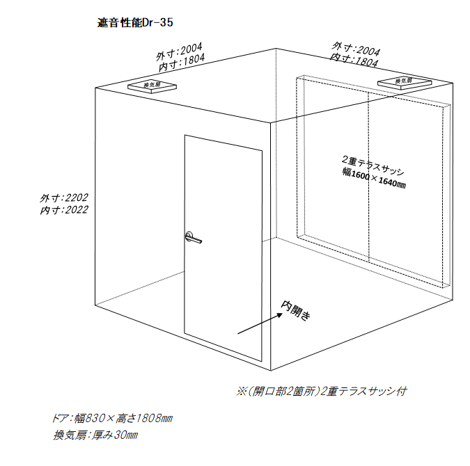 | 仕様 | 床:浮床構造(底床+グラスウール・センチュリーボード・合板)カーペット仕上げ 壁:鉄板複合3重壁構造 天井:換気ダクト内蔵複合天井・クロス仕上げ 開口部:木製防音・2重テラスサッシ 装備:照明・換気扇・コンセント |