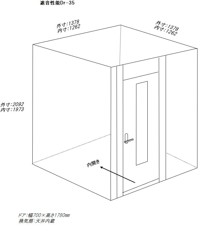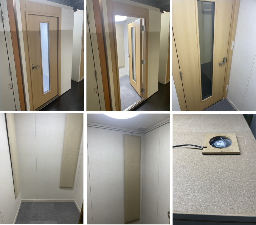 仕様 | 床:遮音床+遮音補強マット1層+タイルカーペット仕上げ 壁:遮音パネル クロス仕上げ 天井:遮音パネル クロス仕上げ ドア:木製防音ドア(2重透明ガラス窓付き)・マグネットパッキン・レバーハンドル 装備:照明・換気扇・2口コンセント・2連スイッチ・吸音パネル |