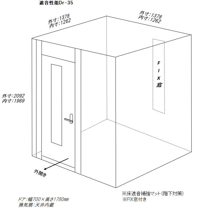 | 仕様 | 床:遮音床+サイルシート2層+タイルカーペット仕上げ 壁:遮音パネル、クロス仕上げ 天井:遮音パネル クロス仕上げ ドア:木製防音ドア(2重透明ガラス窓付き)・マグネットパッキン・レバーハンドル 装備:照明・換気扇・2口コンセント・2連スイッチ・吸音パネル・FIX窓付 |