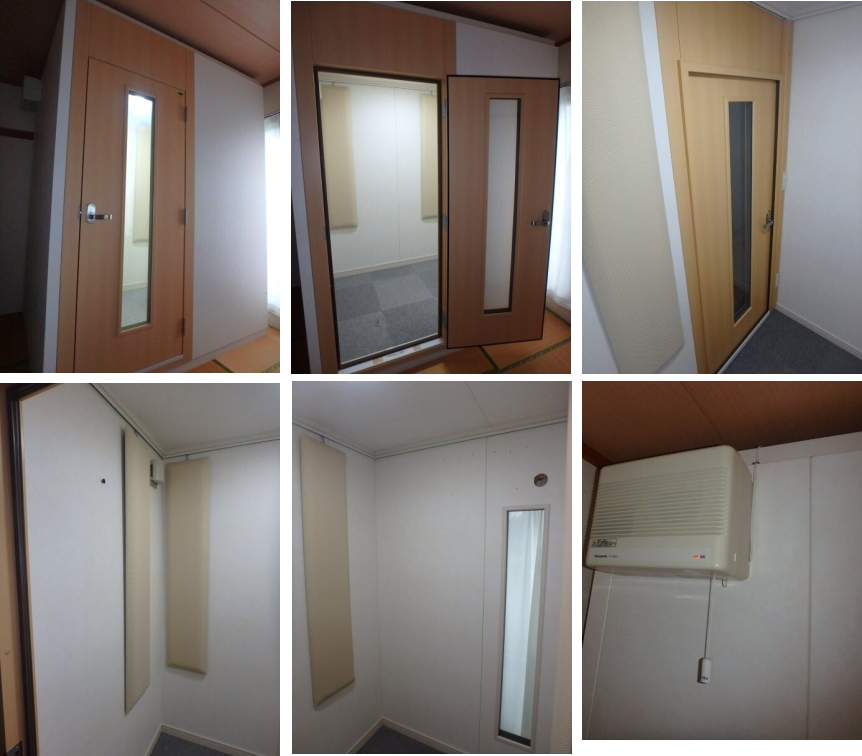 仕様 | 床:合板+防振+防音浮き床+タイルカーペット仕上げ 壁:クロス仕上げ、遮音パネル 天井:クロス仕上げ、遮音パネル ドア:木製防音ドア(2重透明ガラス窓付き) 装備:照明・換気扇・2口コンセント・スイッチ・吸音パネル |