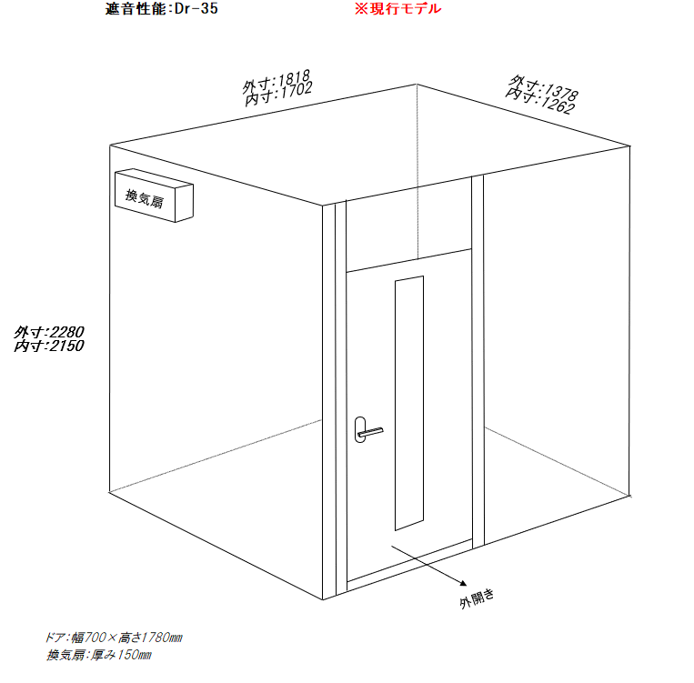 外寸:1378×1818(換気扇+150)×2280㎜ 内寸:1262×1702×2150㎜ |