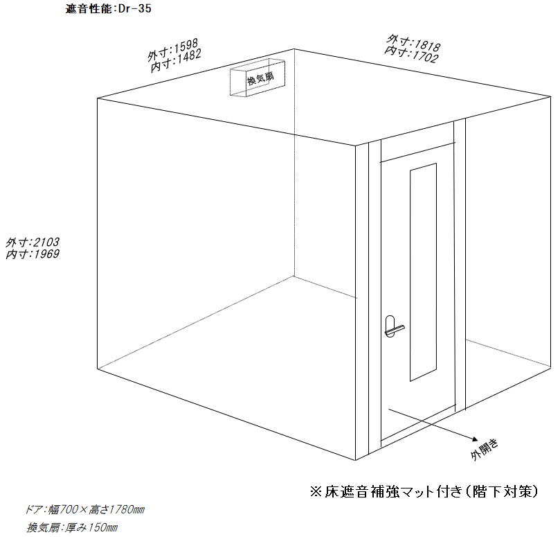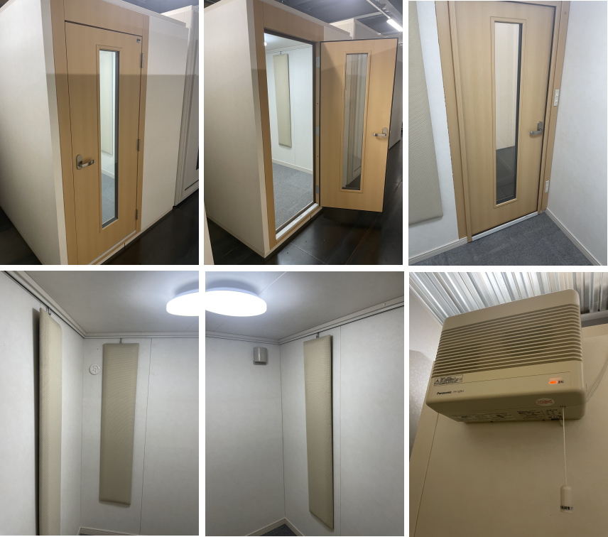 仕様 | 床:防振・防音浮床構造、床遮音補強マット2層、カーペット仕上げ 壁:遮音壁パネル、クロス仕上げ 天井:天井遮音パネル・クロス仕上げ ドア:木製防音ドア(2重透明ガラス窓付き)・マグネットパッキン・レバーハンドル 装備:照明・換気扇・2連スイッチ・2口コンセント・吸音パネル |