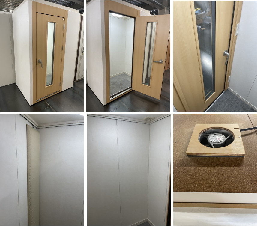 仕様 | 床:防音・防振浮き床・サイルシート2層タイルカーペット仕上げ 壁:遮音パネル、クロス仕上げ、壁掛け吸音パネル付き 天井:換気内蔵、クロス仕上げ、遮音パネル ドア:木製防音ドア(2重透明ガラス窓付き)・2重ゴムパッキン・グレモンハンドル 装備:照明・スイッチ・2口コンセント・吸音パネル |