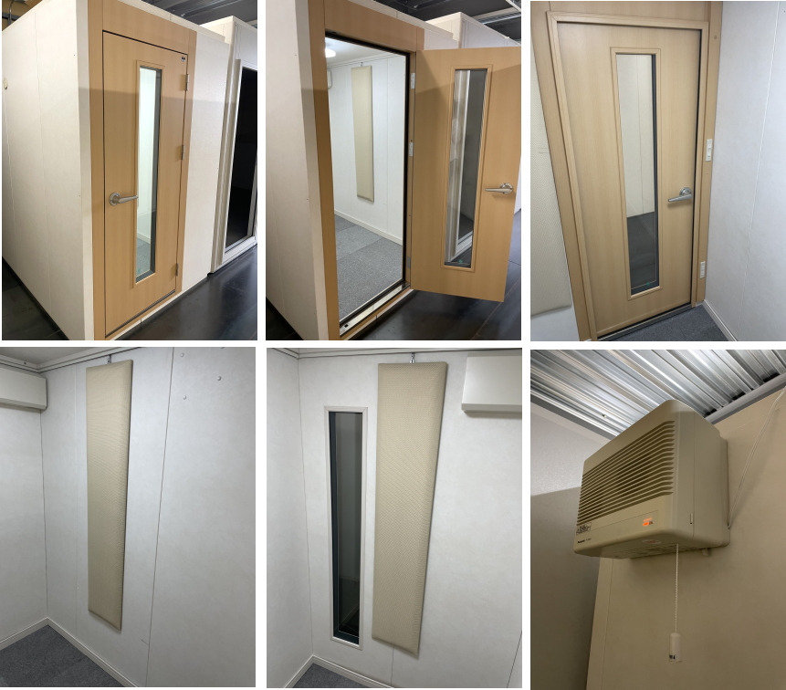 仕様 | 床:床下合板+防振・防音浮床構造+サイルシート+タイルカーペット仕上げ 壁:壁遮音パネル(クロス仕上げ) 天井:天井換気遮音パネル(クロス仕上げ) ドア:木製防音ドア(2重透明ガラス窓付き)・2重ゴムパッキン・グレモンハンドル 装備:換気扇・2口コンセント・照明・吸音パネル・FIX窓付き |