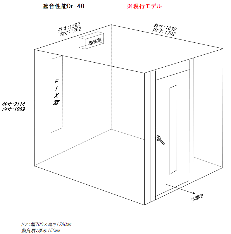 外寸:1392×1832(換気+150)×2114㎜ 内寸:1262×1702×1969㎜ |