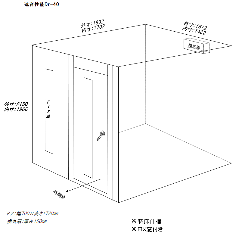 外寸:1832(換気+150)×1612×2150㎜ 内寸:1702×1482×1965㎜ |