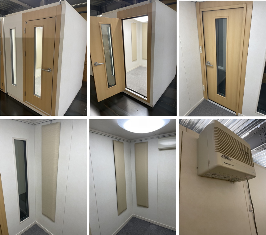 | 仕様 | 床:特床仕様、サイルシート3層、カーペット仕上げ 壁:壁遮音パネル(クロス仕上げ) 天井:天井遮音パネル(クロス仕上げ) ドア:木製防音ドア(2重透明ガラス窓付き)・2重ゴムパッキン・グレモンハンドル 装備:換気扇・2口コンセント・照明・吸音パネル・FIX窓 |