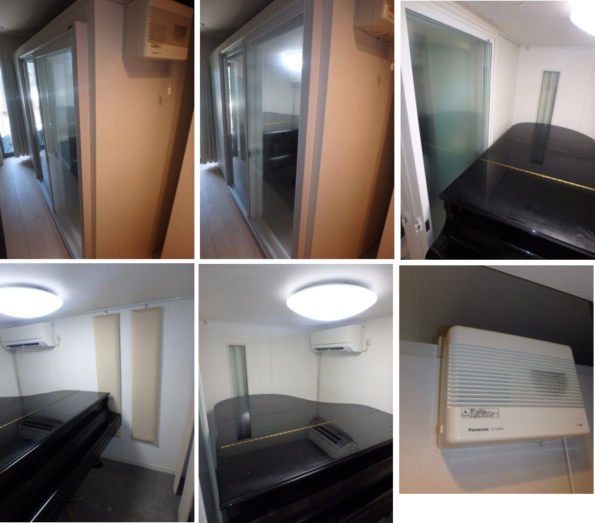 仕様 | 床:防振、防音浮き床(底床+GW+仕上げ合板+サイルシート・カーペット仕上げ) 壁:木製遮音パネル・クロス仕上げ 天井:低音吸音パネル・内部化粧板仕上げ 開口部:2重テラスサッシLサイズ 装備:換気扇・2口コンセント・照明・FIX窓 |