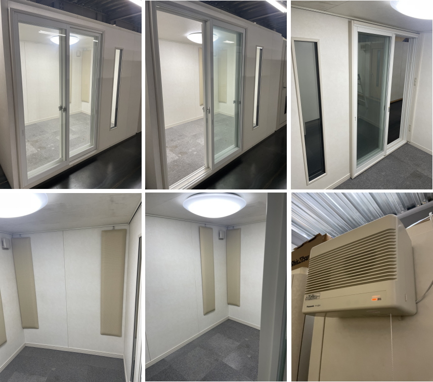 | 仕様 | 床:防振、防音浮き床(底床+GW+仕上げ合板+サイルシート2層・カーペット仕上げ) 壁:木製遮音パネル・クロス仕上げ 天井:低音吸音パネル・内部化粧板仕上げ 開口部:2重テラスサッシMサイズ 装備:換気扇・2口コンセント・照明・吸音パネル・FIX窓 |