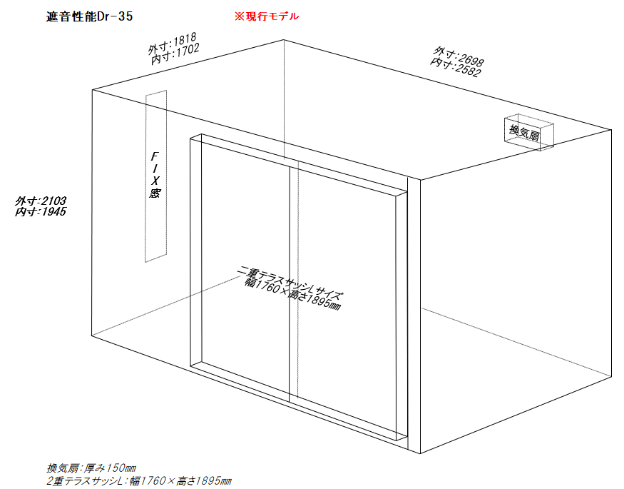 外寸:1818(換気+150)×2698×2103㎜ 内寸:1702×2582×1945㎜ |