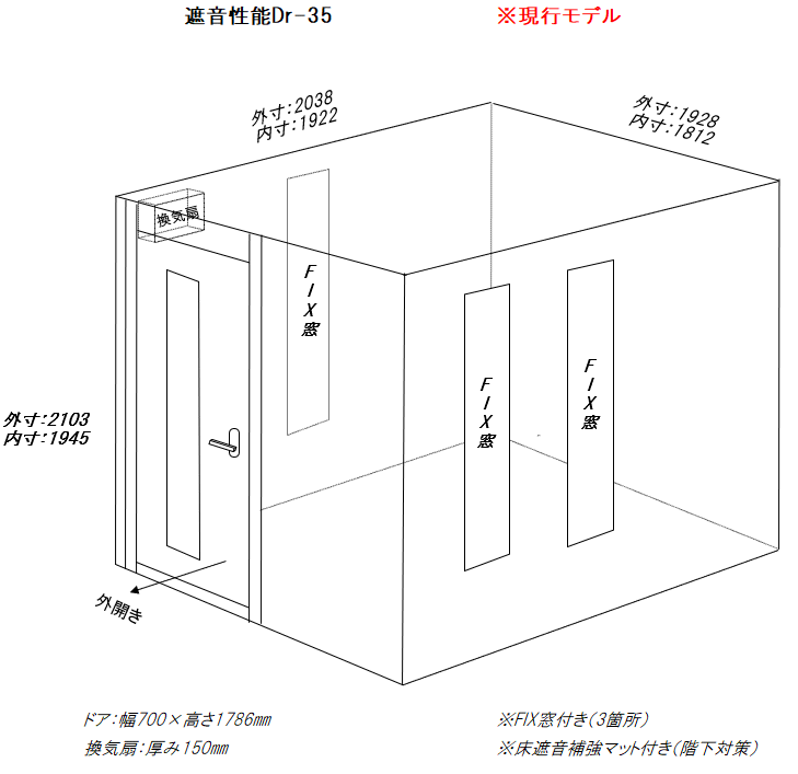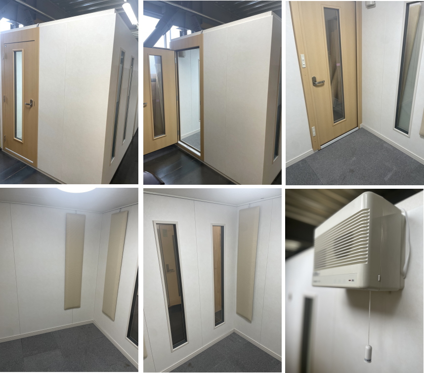 | 仕様 | 床:防振浮き床浮上構造+床遮音補強マット+カーペット仕上げ) 壁:遮音壁パネル・クロス(非塩ビ)仕上げ 天井:遮音パネル・クロス(非塩ビ)仕上げ 開口部:木製防音ドア(2重透明ガラス窓付き)・マグネットパッキン・レバーハンドル 装備:照明・換気扇・2口コンセント・吸音パネル・FIX窓3箇所 |
