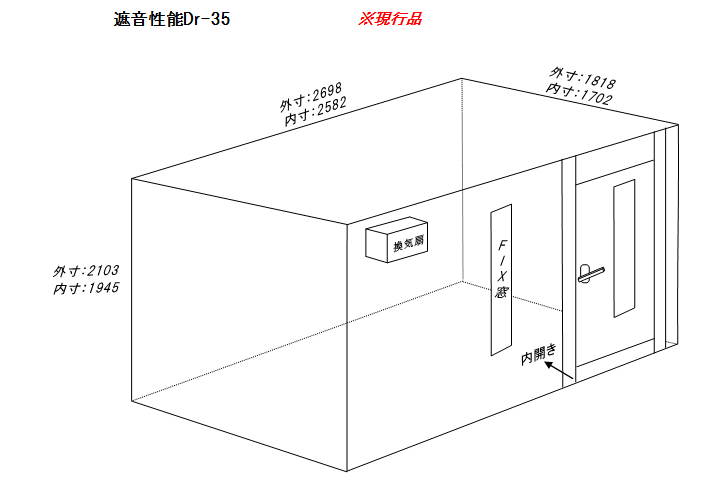 | 仕様 | 床:防振、防音浮き床、タイルカーペット仕上げ 壁:遮音パネル、クロス仕上げ、壁掛け吸音パネル付き 天井:低音吸音パネル、内部化粧板仕上げ ドア:木製防音ドア(2重透明ガラス窓付き) 装備:照明・換気扇・2口コンセント・スイッチ |