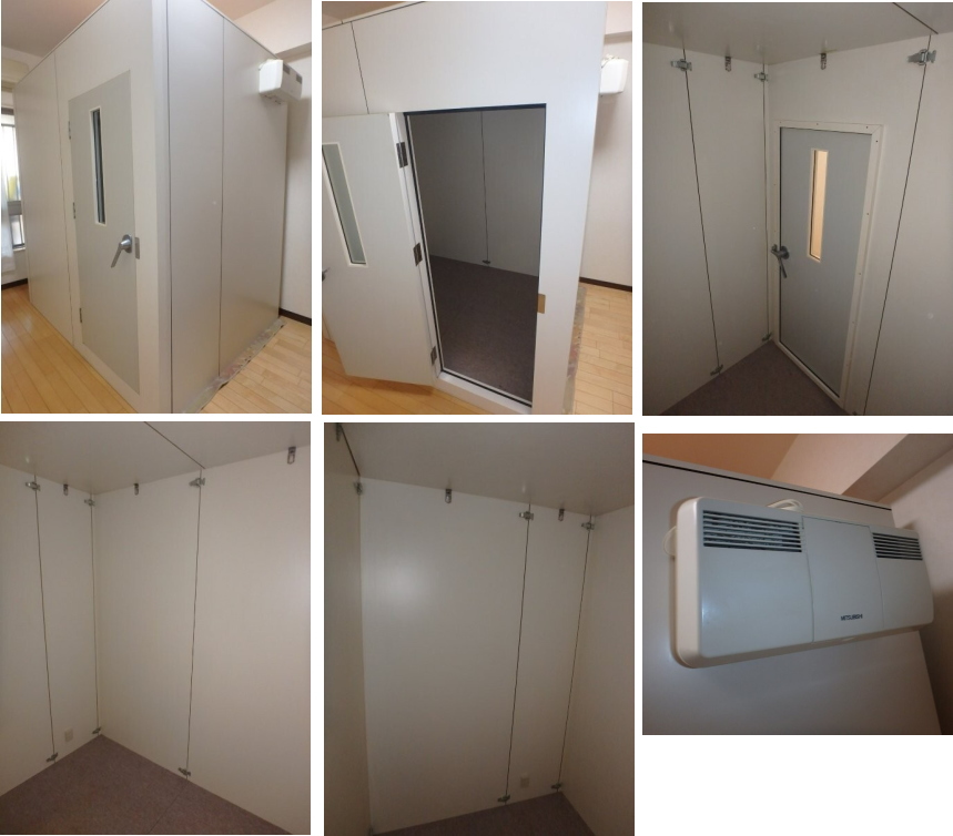 仕様 | 床:底床・カーペット仕上げ 壁:遮音壁パネル 天井:遮音天井パネル ドア:木製防音ドア(透明窓付き) 装備:換気扇・2口コンセント |