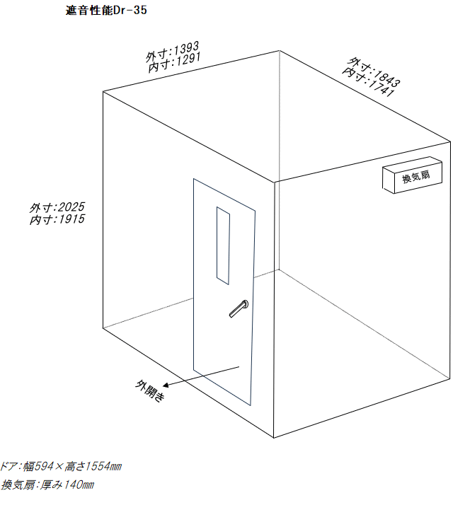 外寸:1393×1843(換気扇+140)×2025㎜ 内寸:1291×1741×1915㎜ |