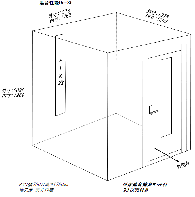 装備:照明・換気扇・2口コンセント・2連スイッチ・吸音パネル・FIX窓付
