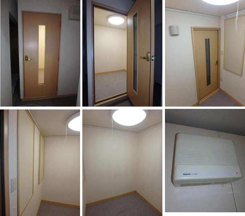 | 仕様 | 床:防振浮き床構造・カーペット仕上げ 壁:遮音壁パネル・クロス仕上げ 天井:遮音パネル・クロス仕上げ ドア:木製防音ドア(2重透明ガラス窓付き)・マグネットパッキン・レバーハンドル 装備:照明・換気扇・2口コンセント・吸音パネル |