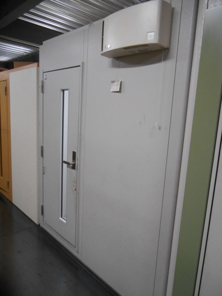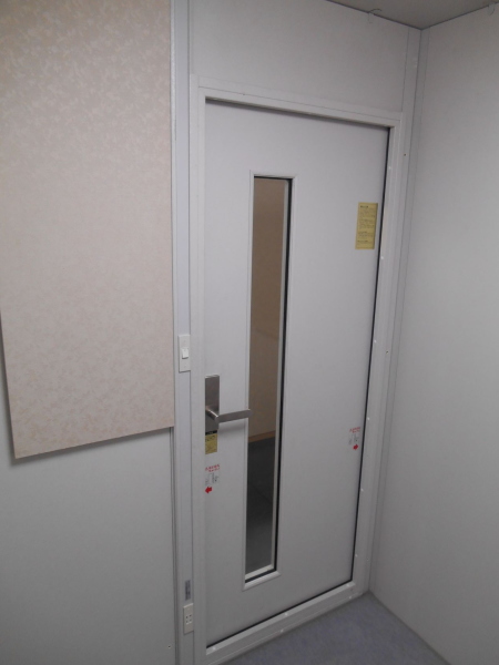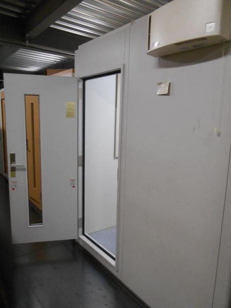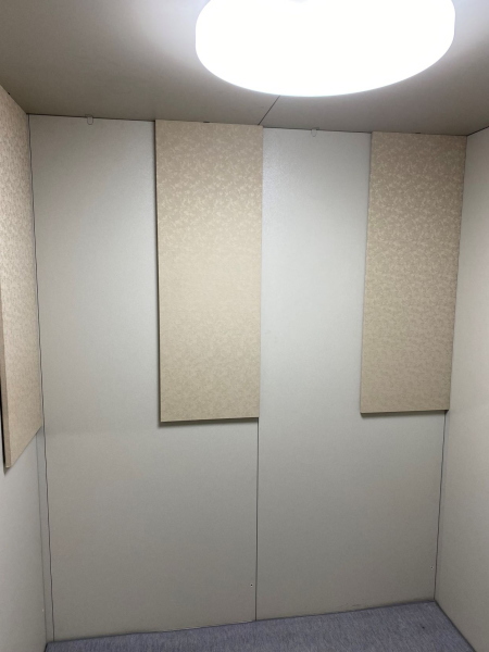 | 仕様 | 床:分割浮床パネルシステム(防振ゴム+床フレーム+遮音床パネル)+カーペット仕上げ 壁:遮音壁パネル・内外装仕上げ:強化化粧紙(パールホワイト色) 天井:遮音天井パネル・内外装仕上げ:強化化粧紙(パールホワイト色) ドア:木製防音ドア(透明ガラス窓付き) 表面:強化化粧紙仕上げ(パールホワイト色) 装備:照明・換気扇・2口コンセント・音場パネル |