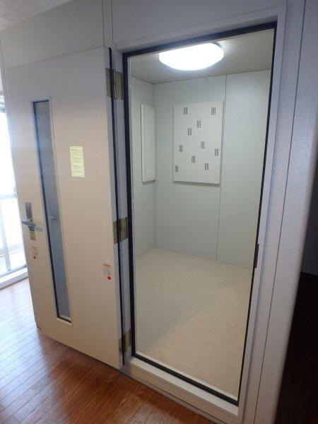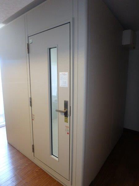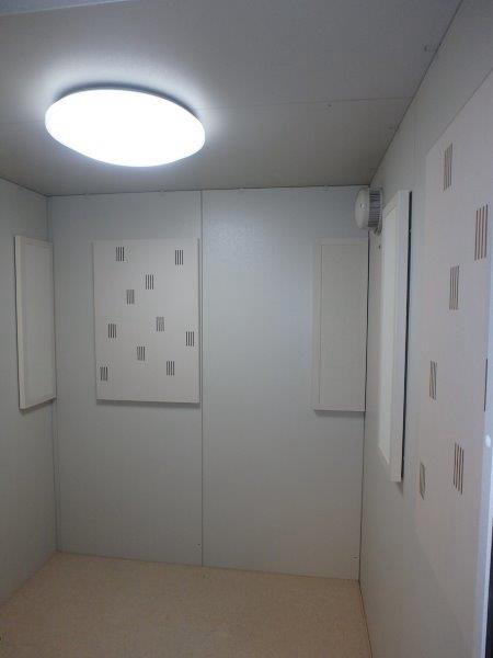 | 仕様 | 床:分割浮床パネルシステム(防振ゴム+床フレーム+遮音床パネル)+高剛性床パネル+カーペット仕上げ 壁:遮音壁パネル・内外装仕上げ:強化化粧紙(パールホワイト色) 天井:遮音天井パネル・内外装仕上げ:強化化粧紙(パールホワイト色) ドア:木製防音ドア(透明ガラス窓付き)・表面:強化化粧紙仕上げ(パールホワイト色) 装備:照明・換気扇・2口コンセント・音場パネル・調音パネル付き |