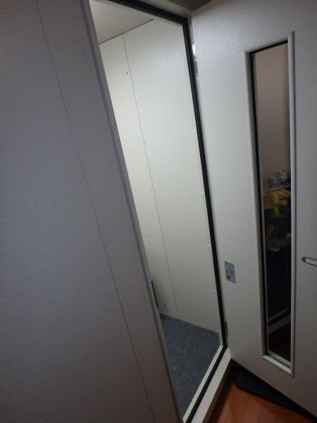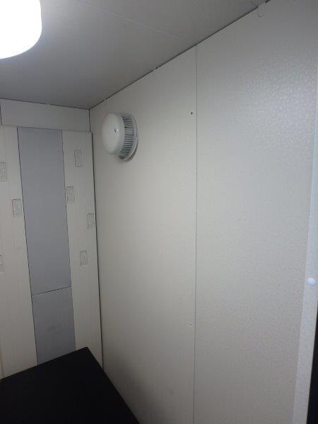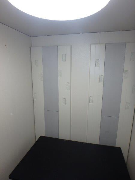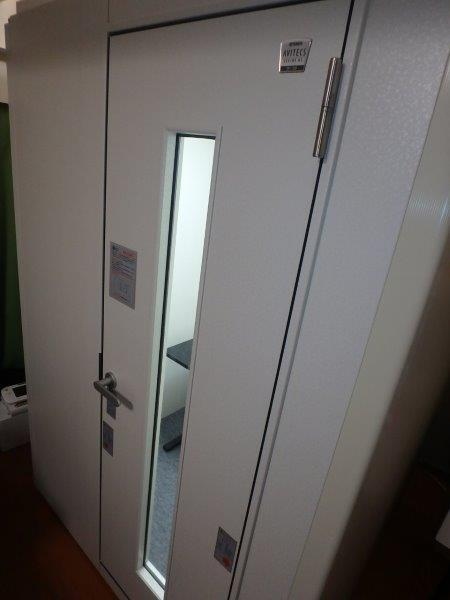 | 仕様 | 床:底床+遮音床パネル・カーペット仕上げ 壁:遮音壁パネル 内外装仕上げ:オレフィンシート(ホワイト系) 天井:遮音天井パネル 内外装仕上げ:オレフィンシート(ホワイト系) ドア:木製防音ドア(透明ガラス窓付き)・内外装仕上げ:オレフィンシート(ホワイト系) 装備:照明・換気扇・2口コンセント・音場パネル |