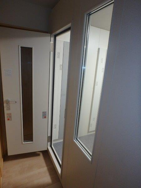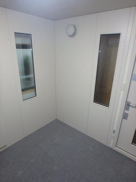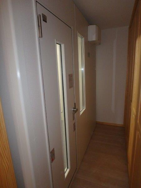 | 仕様 | 床:防振ゴム+床フレーム+遮音床パネル・カーペット仕上げ 壁:遮音壁パネル 内外装仕上げ:オレフィンシート(ホワイト系) コーナー保護カバー:ABS樹脂押出材 天井:遮音天井パネル 内外装仕上げ:オレフィンシート(ホワイト系) ドア:木製防音ドア(透明ガラス窓付き)・内外装仕上げ:オレフィンシート(ホワイト系) 装備:照明・換気扇・2口コンセント・音場パネル・照明スイッチ・FIX窓2ヶ所 |