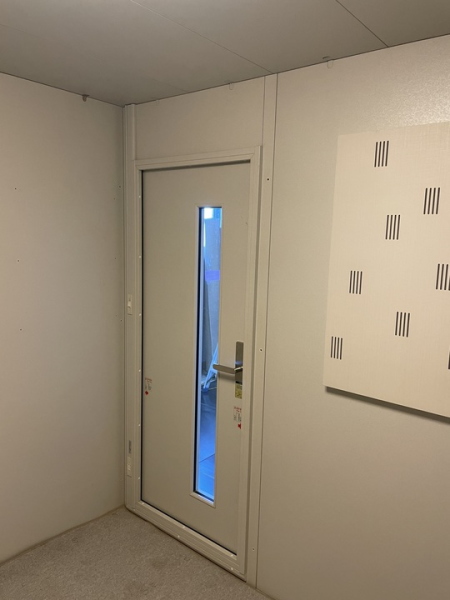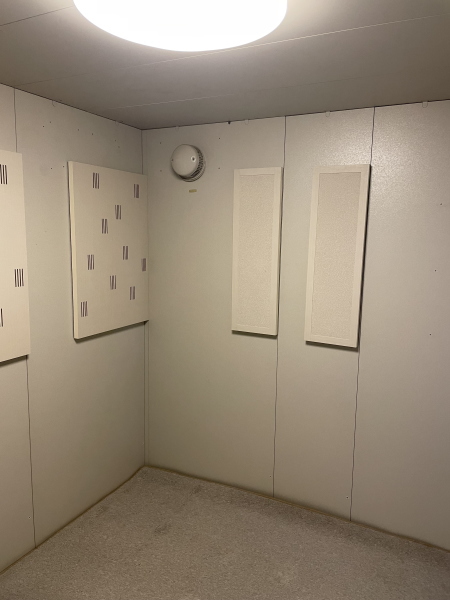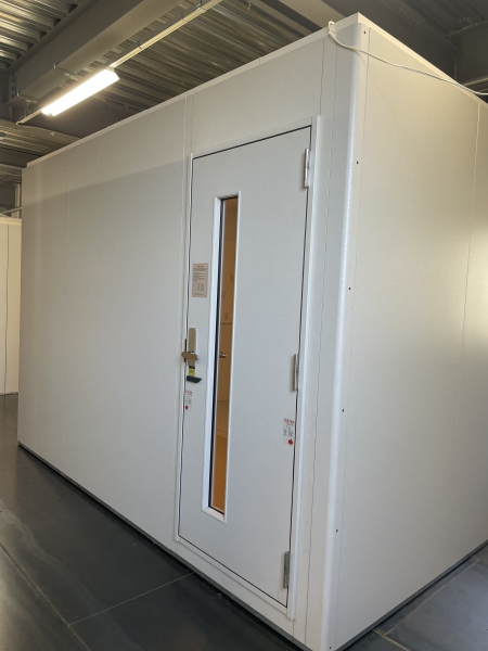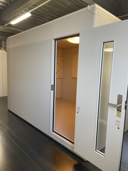 | 仕様 | 床:底床+防振ゴム+床フレーム+遮音床パネル・カーペット仕上げ 壁:遮音壁パネル 内外装仕上げ:強化化粧紙(パールホワイト色) 天井:遮音天井パネル 内外装仕上げ:強化化粧紙(パールホワイト色) ドア:木製防音ドア(透明ガラス窓付き)・表面:強化化粧仕上げ(パールホワイト色) 装備:換気扇・2口コンセント・照明・音場パネル・調音パネル付き |