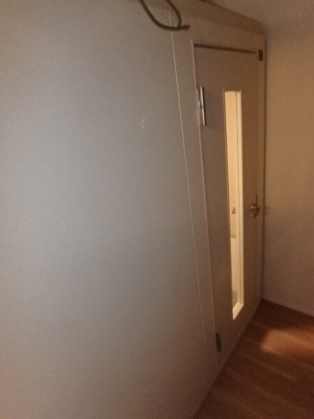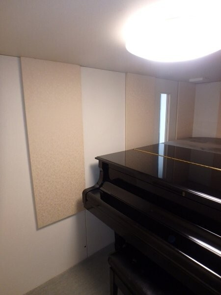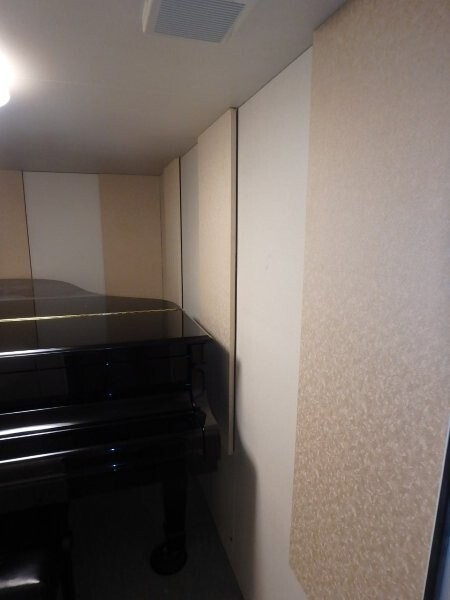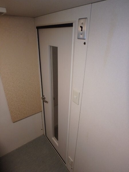 | 仕様 | 床:底床+遮音床パネル+厚床パネル・カーペット仕上げ 壁:音場壁パネル・布クロス仕上げ 天井:天井パネル・ビニールクロス仕上げ(ホワイト系) ドア:木製防音ドア(透明窓付き)・塩ビシート仕上げ(アイボリー系) 装備:照明・換気扇・2口コンセント・音場パネル・FIX窓 |