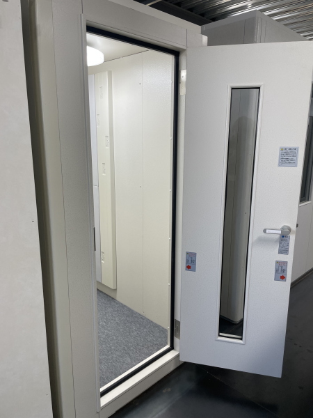 | 仕様 | 床:底床+遮音床+カーペット仕上げ 壁:遮音壁パネル 内外装仕上げ:オレフィンシート(ホワイト系) 天井:遮音天井パネル 内外装仕上げ:オレフィンシート(ホワイト系) ドア:木製防音ドア(透明ガラス窓付)・内外装仕上げ:オレフィンシート(ホワイト系) 装備:照明・換気扇・2口コンセント・音場パネル(壁掛けタイプ) |