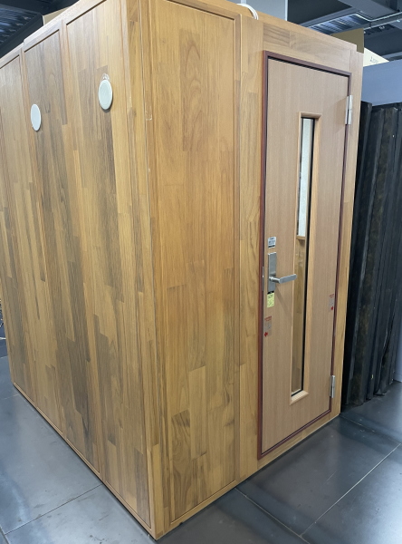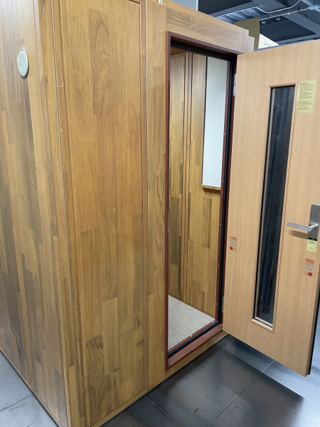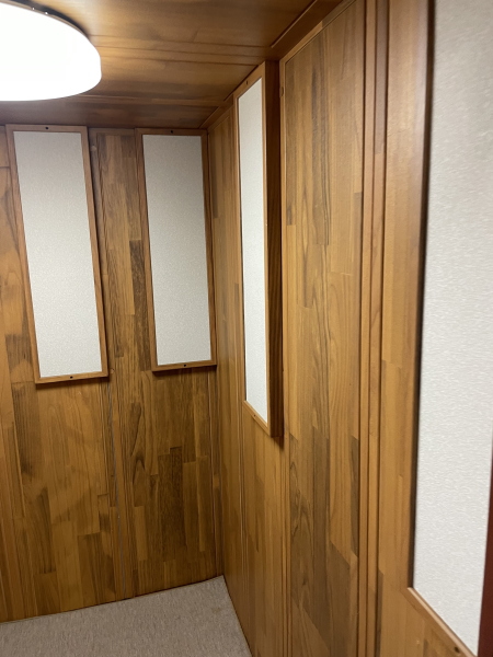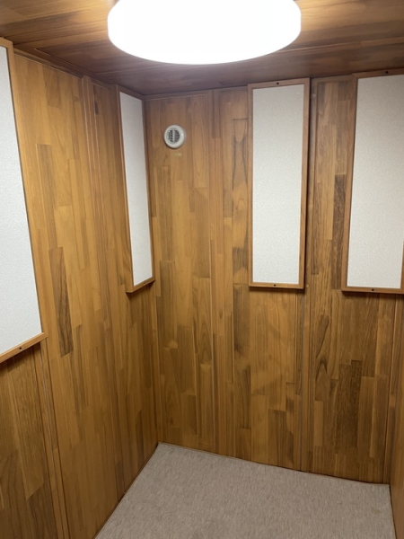 | 仕様 | 床:底床+遮音床パネル・カーペット仕上げ 壁:遮音壁パネル 桐(天然木ポリウレタン塗装仕上げ) カラー:ウォームオレンジ 天井:遮音天井パネル 桐(天然木ポリウレタン塗装仕上げ) カラー:ウォームオレンジ ドア:木製防音ドア(透明ガラス窓付き)・表面:強化化粧紙仕上げ(木目調) 装備:照明・換気扇・2口コンセント・音場パネル |
